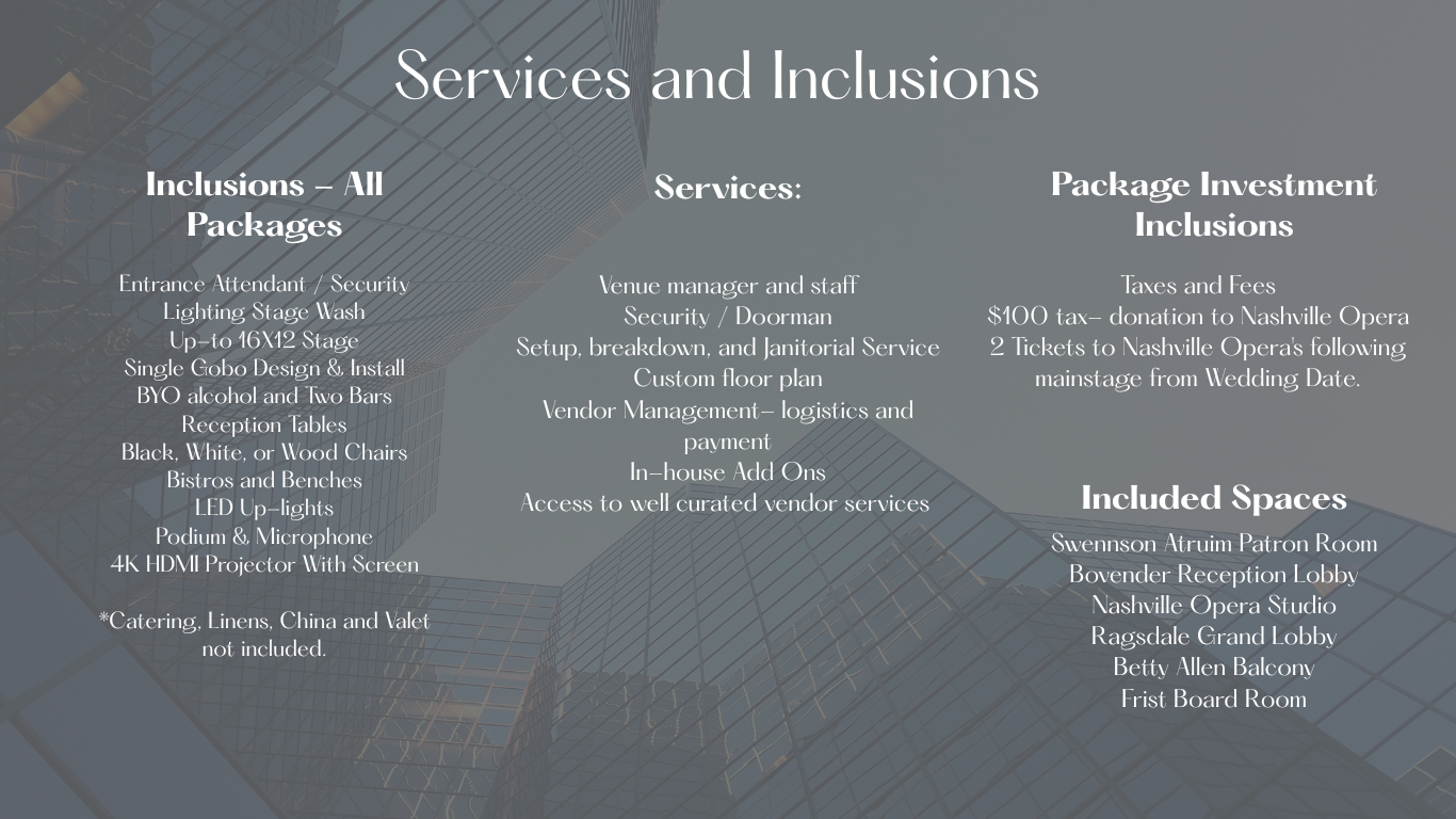 Our curated vendor list is your go-to resource for quality and efficiency of planning. These approved partners each bring experience with and knowledge of The Noah Liff Opera Center as well as the expertise to produce your event.