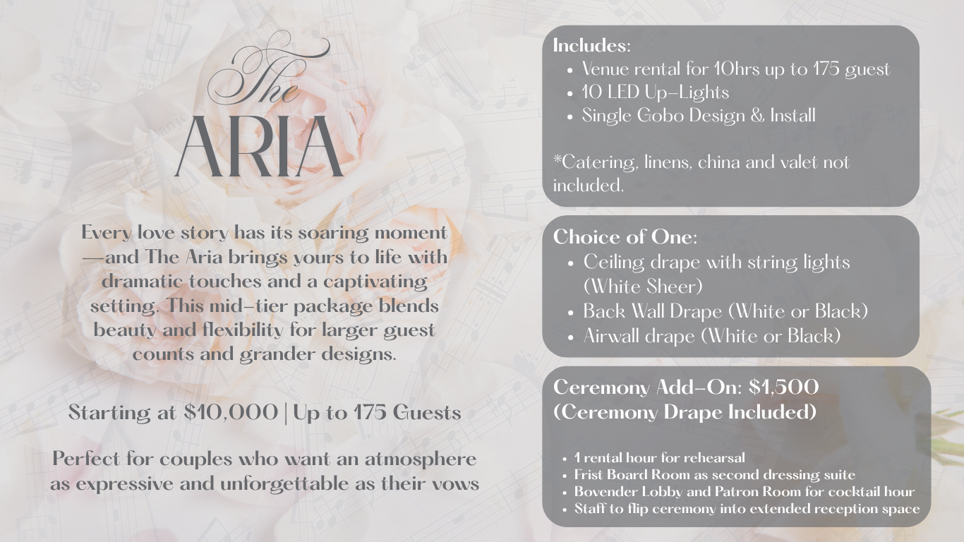 The Aria invites you to take the spotlight with a celebration full of movement, meaning, and melody. With space for up to 175 guests, your event flows with elegance—from sweeping ceiling drapes lit with string lights to romantic backdrops that transform the room into a soft, glowing dream.