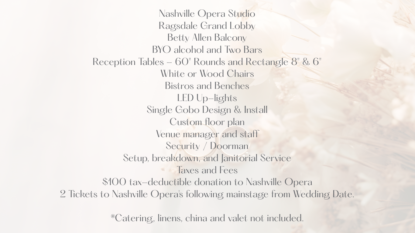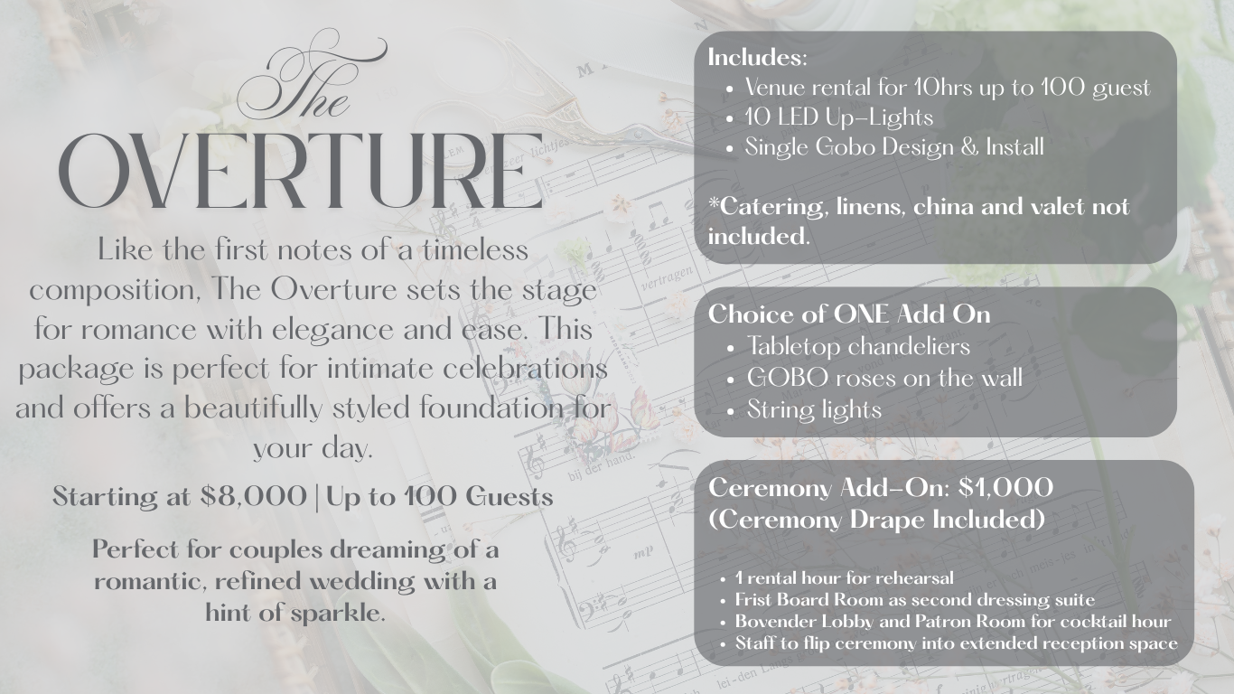 From elegant staging to modern tech and flexible spaces, every package includes the foundational elements that set the stage for your unforgettable day.